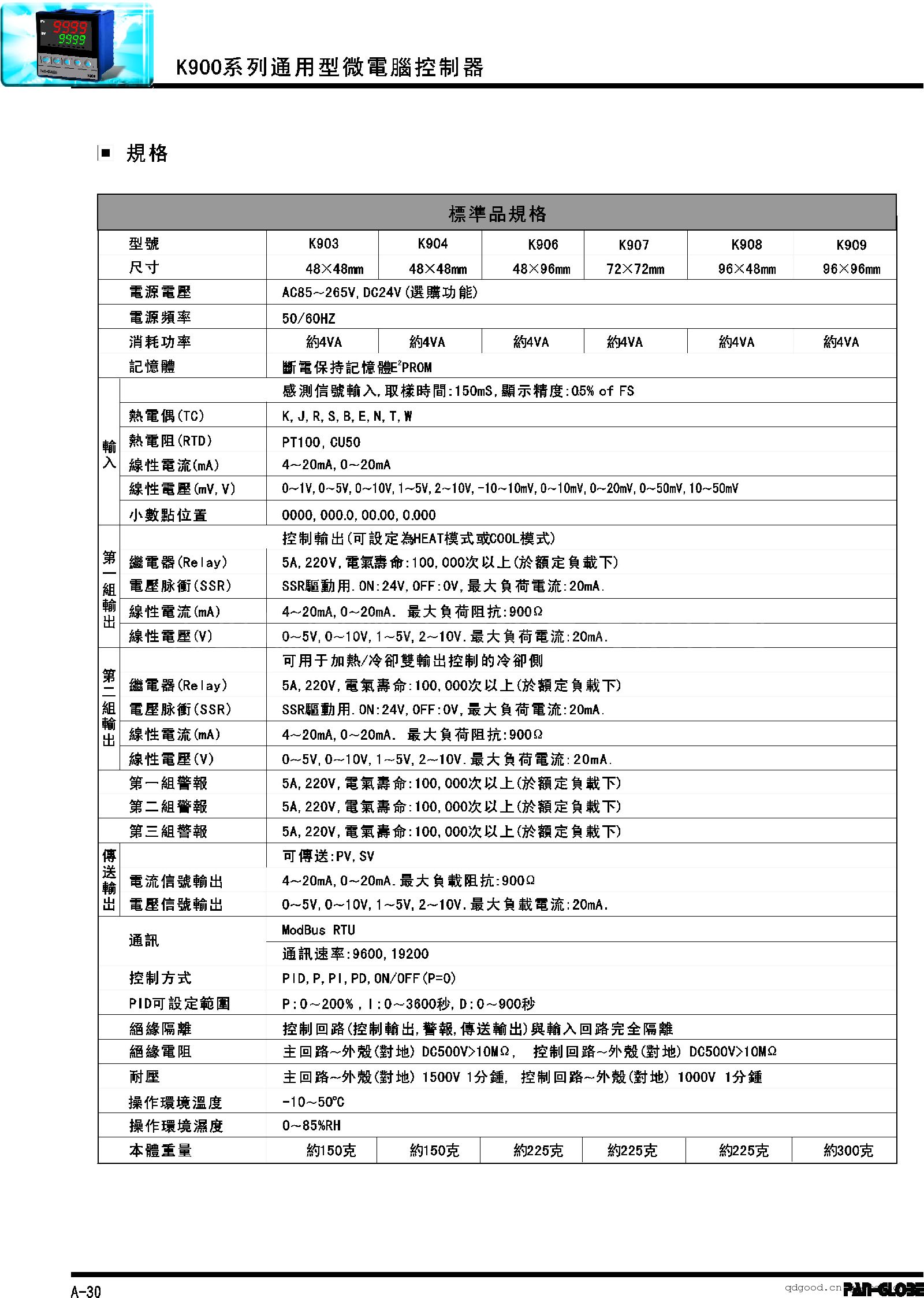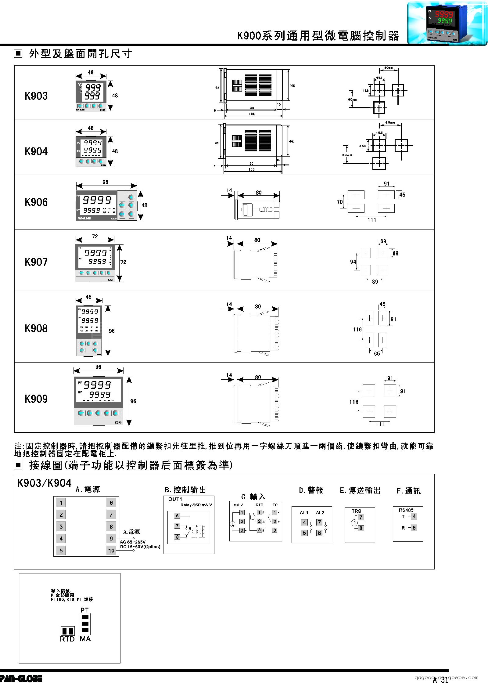 台湾泛达k909系列温控器可用来精确控制温度、压力、流量等。应用在陶瓷、制药、玻璃、建材、冶金、热处理、化工、橡胶机械、包装机械、食品机械及各种普通电炉、烘箱等领域。对比普通精度的温控器可为客户节约1-5%左右的能源消耗,降低了客户的生产成本及CO2排放。